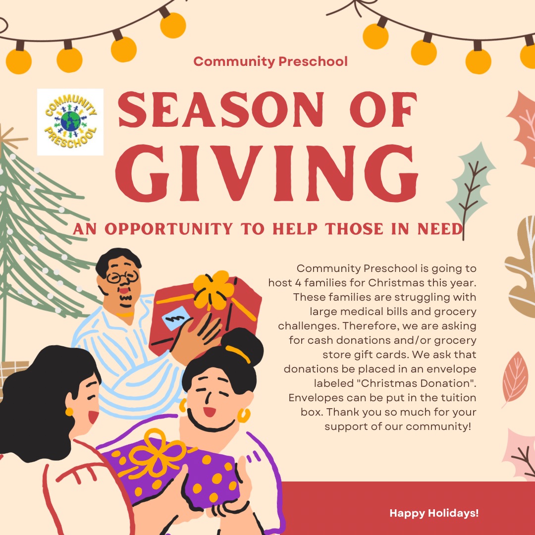 If you need to make a tax-deductible contribution before the end of the year, please consider making a donation by selecting the Donate button above. Community Preschool, is a registered nonprofit 501(c)(3).