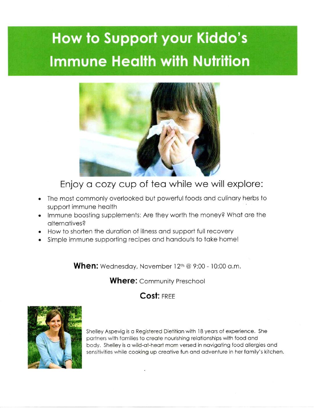 Shelley Aspevig, an alumni Mom is offering a free class for Parents, "How to Support Your Kiddo's Immune Health with Nutrition," on Wednesday, November 12th from 9 - 10 a.m. We will meet in the gym at the preschool.